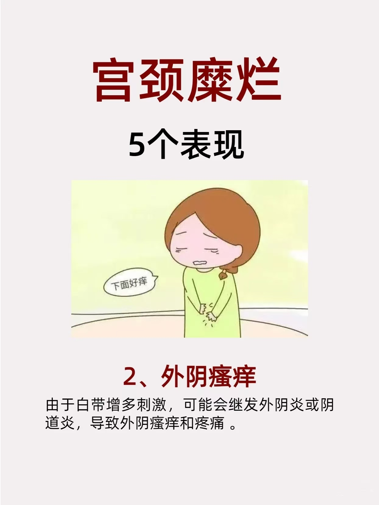 第四,多次人工流产,使得宫颈造成不同程度的损伤,宫颈对病菌的抵抗力下降,给了病菌可乘之机,也容易引发宫颈糜烂。